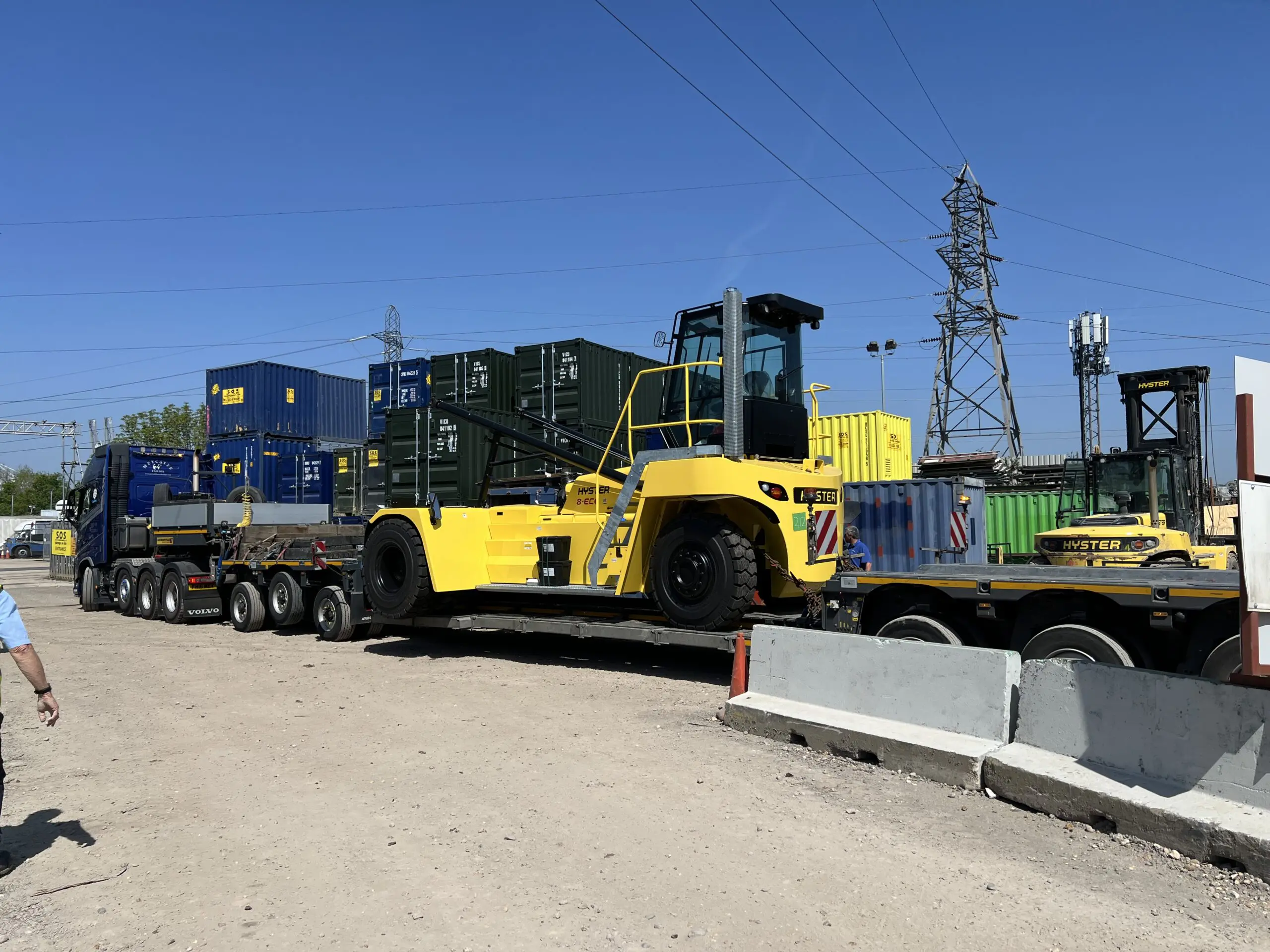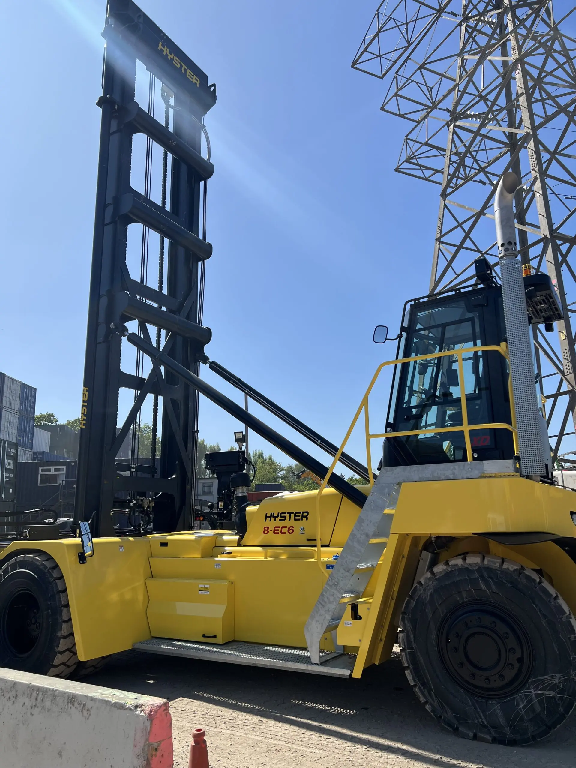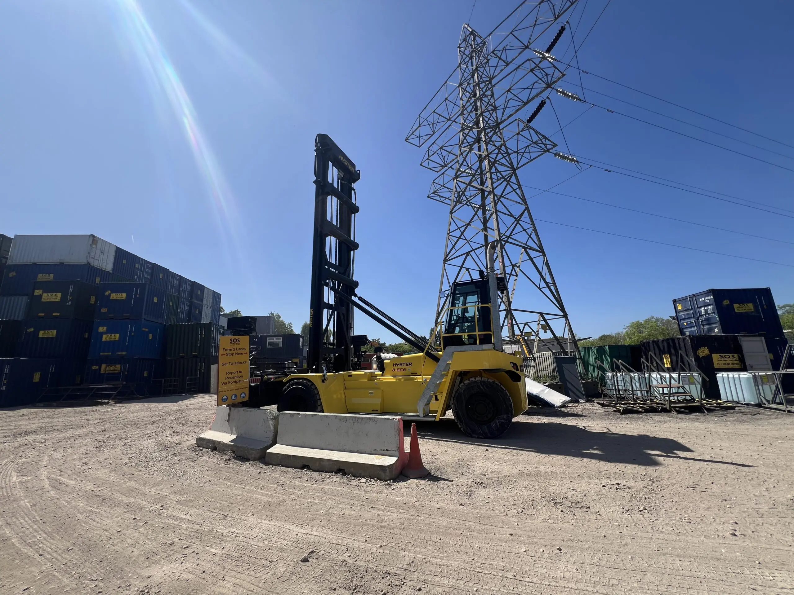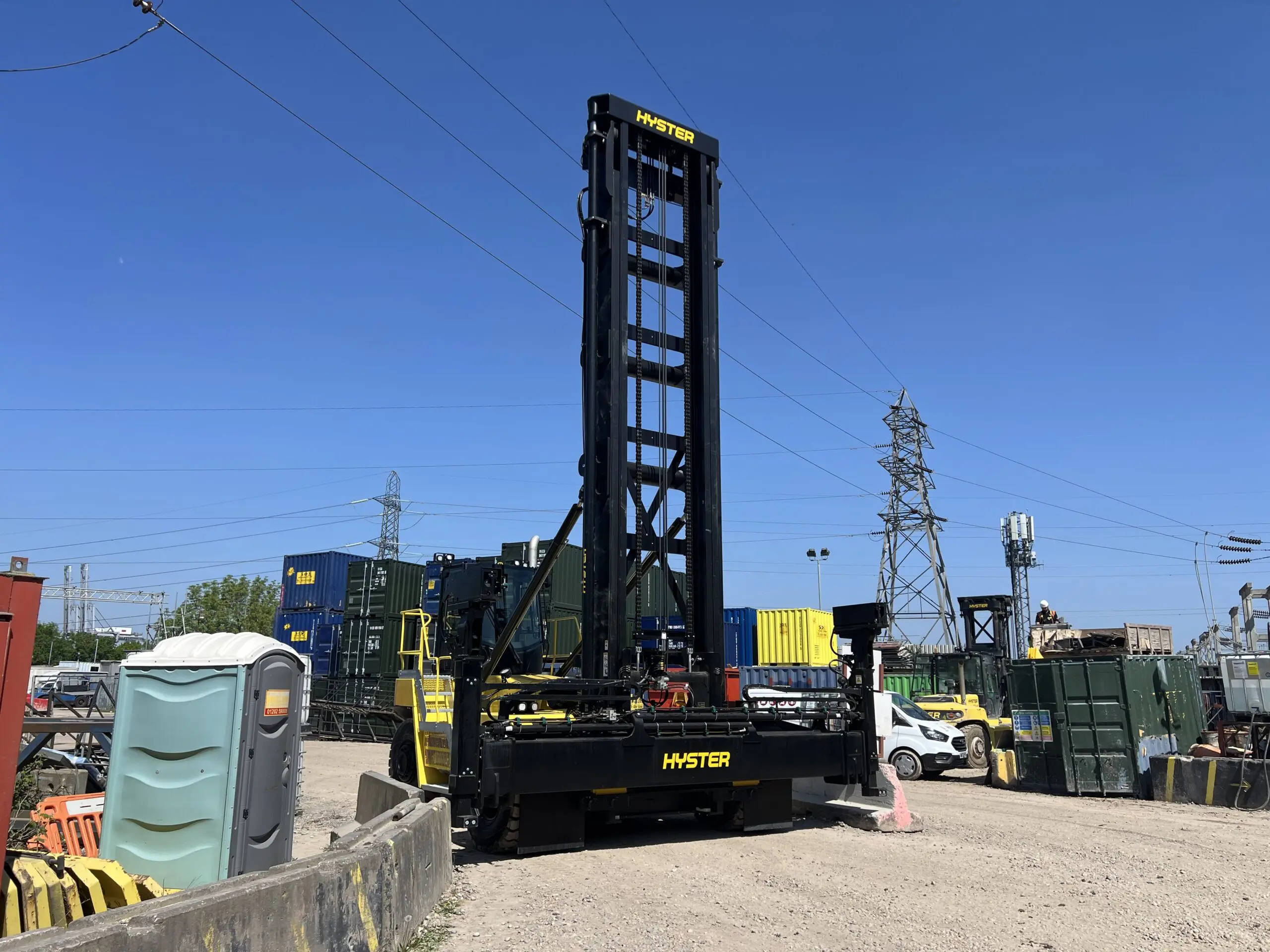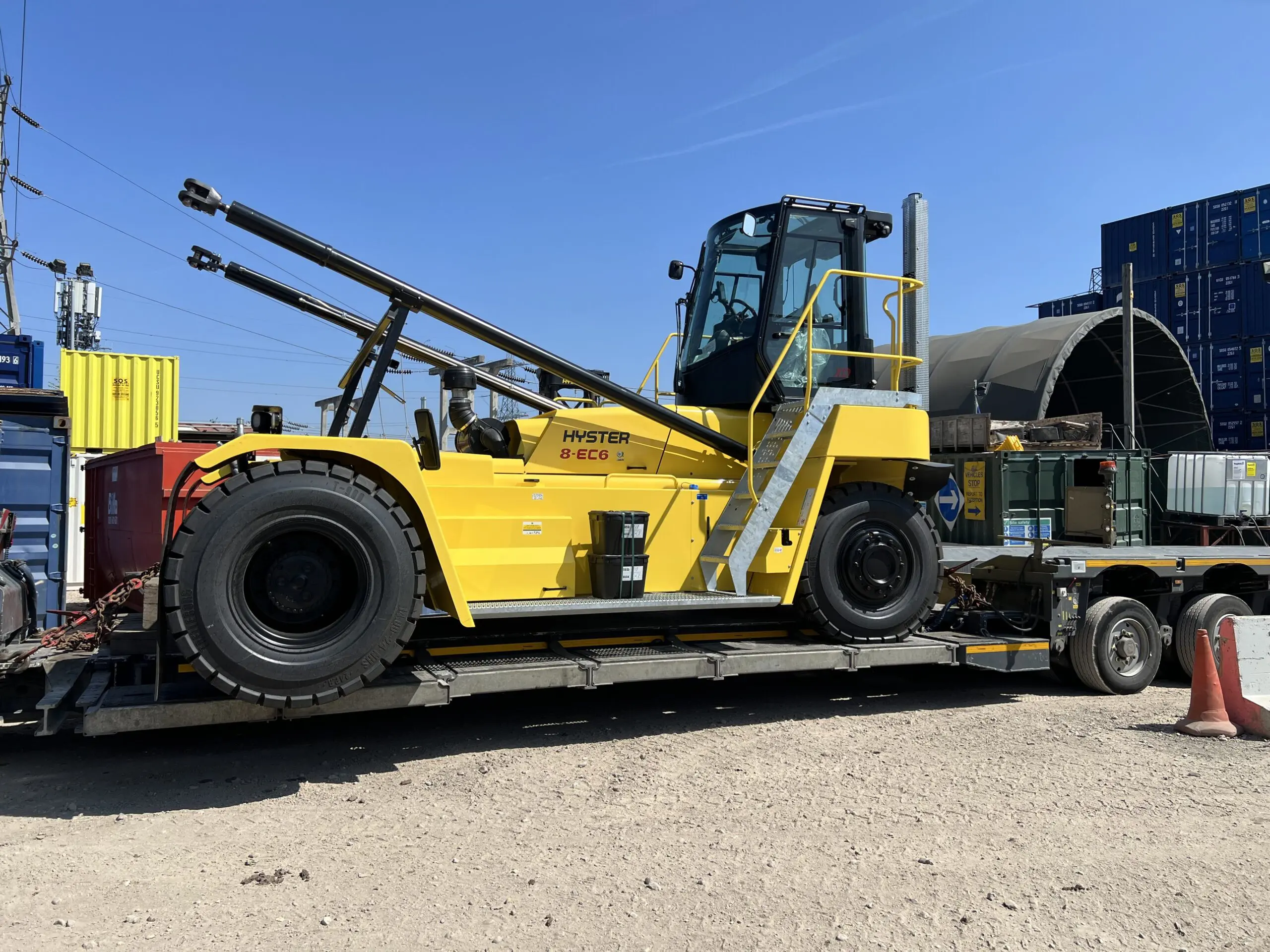 The Hyster EC-6 series is renowned for its robust performance and efficiency in container handling. With a lifting capacity of 8 tonnes, it enables us to lift and organise up to 40ft containers with ease, ensuring faster turnaround times and enhanced safety on-site. The immense size of this stacker’s masts allows our team to store even more containers and cabins on site vertically, with the same square footage.