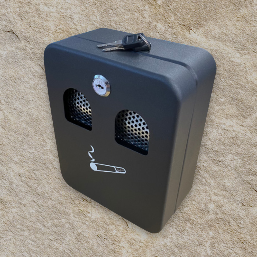Wall-mounted smoking ash bin designed for use outside containers and workplaces to maintain site cleanliness.