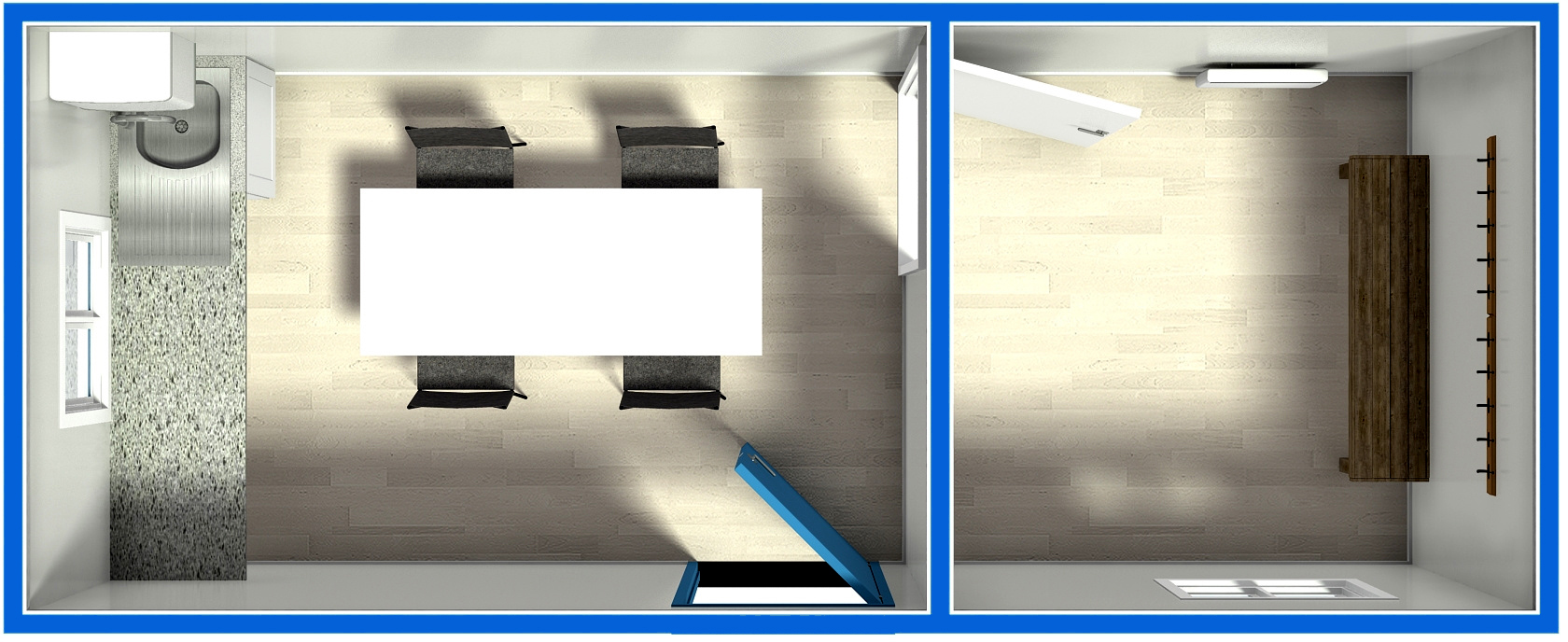 (60/40 layout, includes sink, water heater, 1 x canteen table & 4 x chairs, 1 x table & 4 x soft chairs)