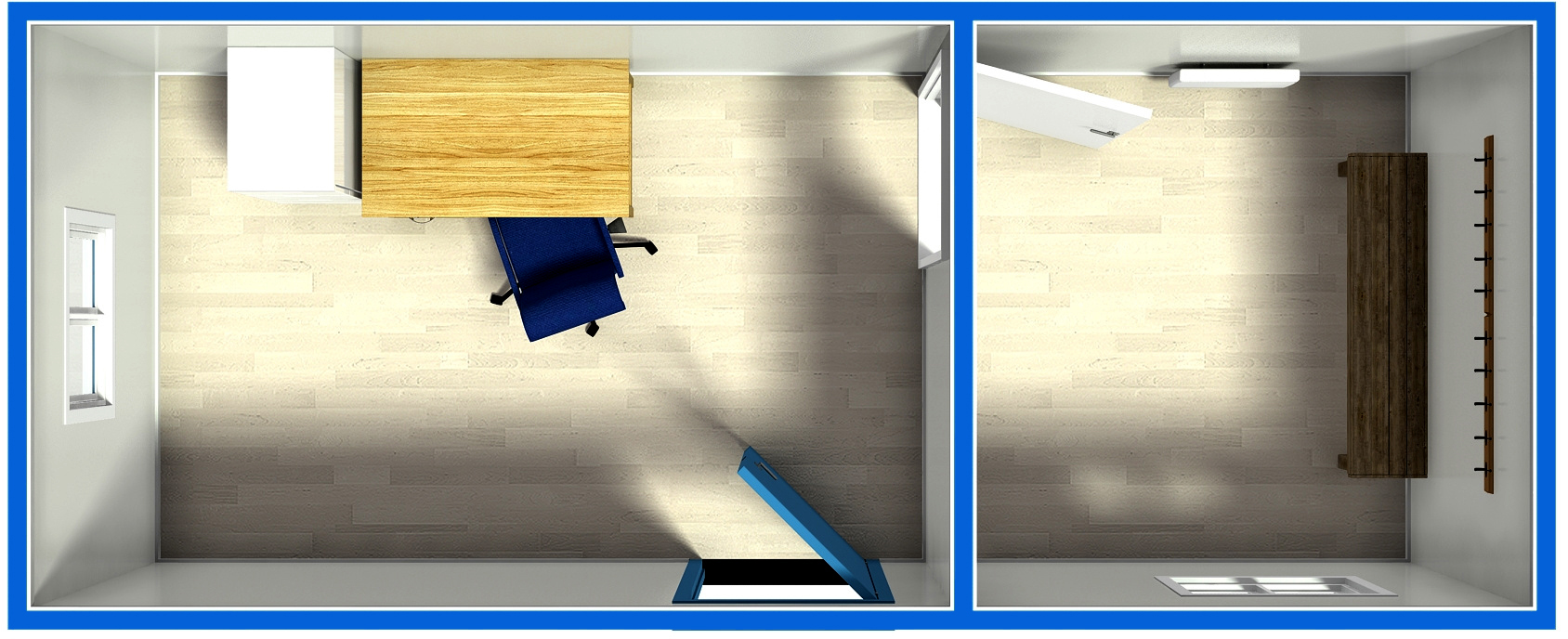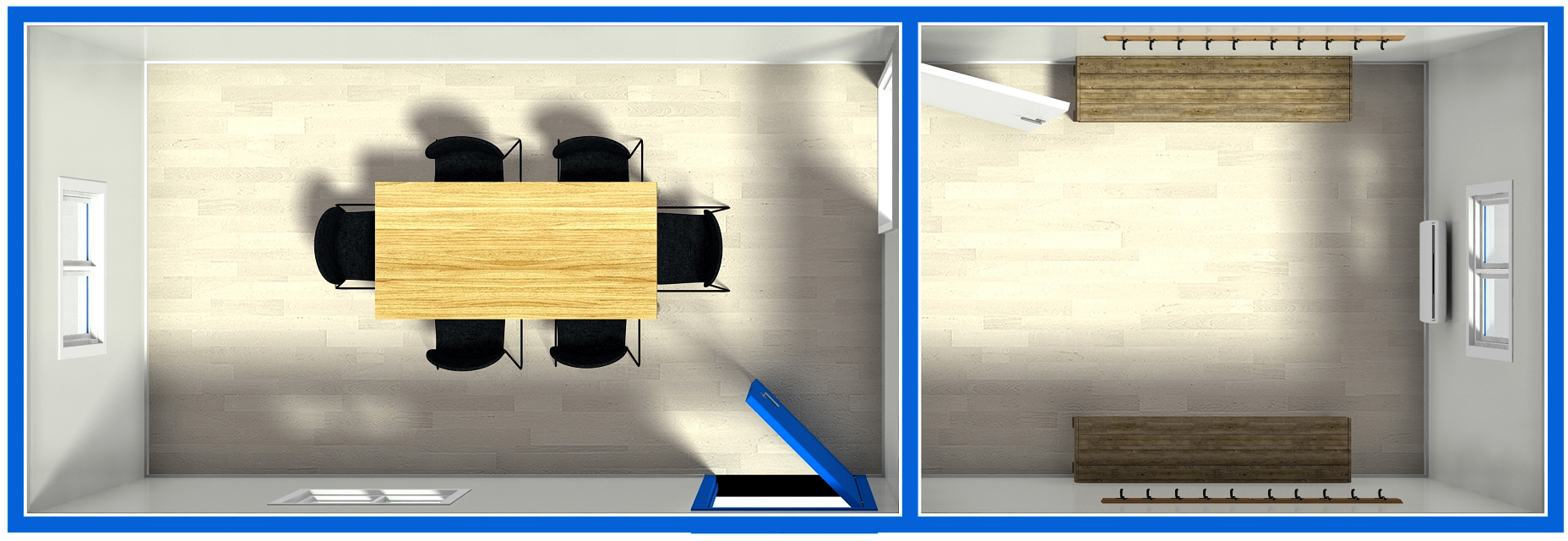 For combination units that include storage, such as an office/store or canteen/store, the layout is always a 50/50 split. For all other cabin combinations (office/canteen or a meeting room/drying room), the layout follows a 60/40 split.