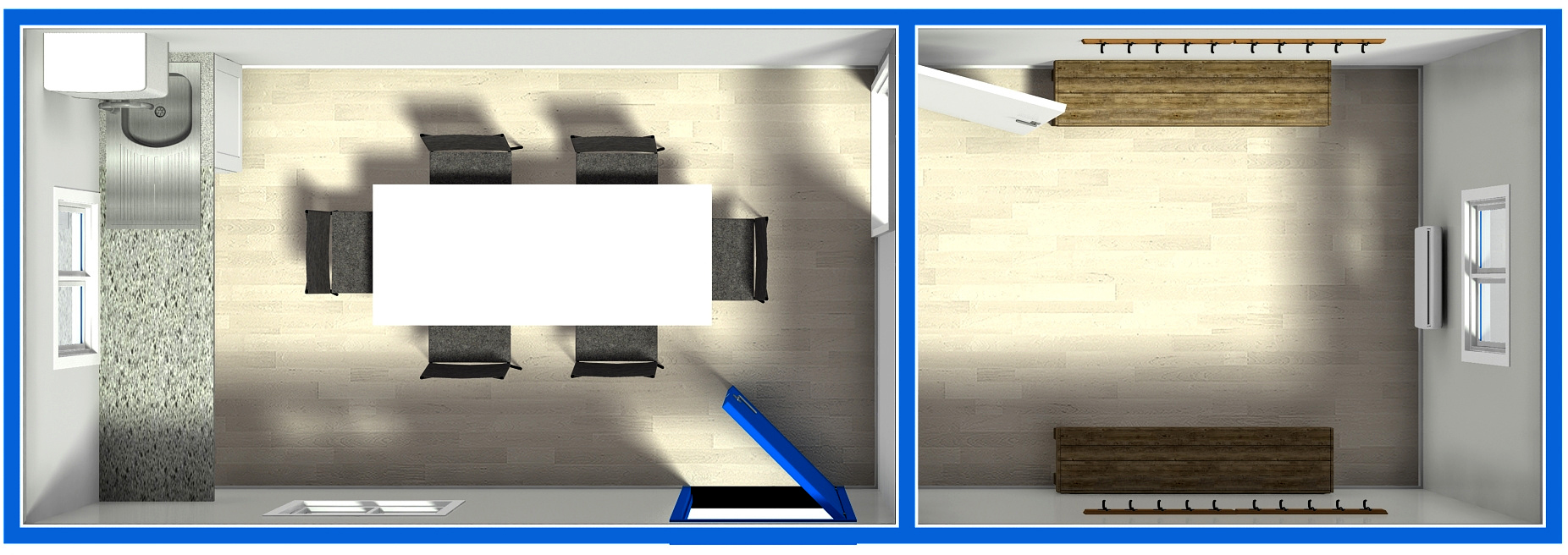 (50/50 layout, includes sink, water heater, 1 x canteen table & 4 x chairs)