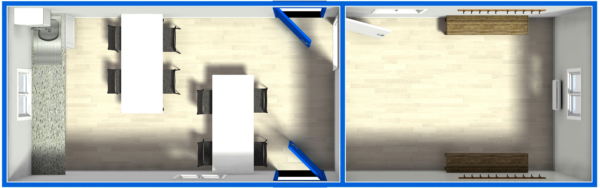 (60/40 layout, includes sink, water heater, 1 x canteen table & 6 x chairs, 1 x table & 6 x soft chairs)